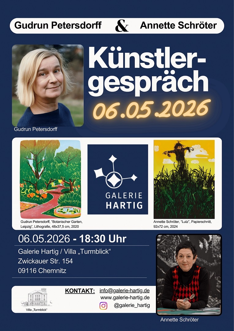 Treffen Sie in der "Villa Turmblick" (Kappler Drehe) im persönlichen Dialog – am Mittwoch, den 06.05.2026 um 18:30 Uhr in der "Galerie Hartig" in der Zwickauer Straße 154 in Chemnitz, direkt auf die beiden Künstlerinnen. Wir laden Sie zu einem amüsanten Abend unter dem Motto "KUNST verbindet" recht herzlich ein.